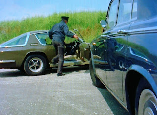 Grabbing the contents of the safe he makes a copy of the document. Rule closes the safe and slips away grabbing a driver's cap to match his navy blue garb and off he goes passed unsuspecting personnel in the compound. Thise seemed a little unlikely. Was it that busy in the house not to notice a stranger? Rule crashes through the front gates and switches into a car that looks awfully familiar to the cars used in UFO. Welcome to the non-stop world of action adventure a la The Protectors.
