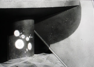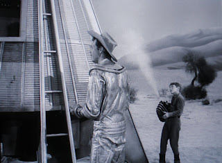 The Hapgood vessel, the Travellin' Man, is indubitably a spaceship for one. I can't imagine being in that thing for long distances. You must get some serious leg cramping. So Hapgood gets this piece of equipment and starts spraying the hull of his ship. He needs to ensure the craft is decontaminated to prevent alien spores mixing with other planetary spores. Who would have thought, but that a nice touch for science fiction. Will offers to spray the hull for him for the chance to hear more of his space adventures when they get back to camp. I love when the cowboy starts grabbing alien plants and stuffing his pipe to smoke it. Now that is living off the land. First he's willing to spray anything alien on the hull of his ship dead, but then stuff it into his pipe so he can breathe it into his lungs. The man is not averse to risk. Will runs off in a hurry and fails to finish the job and spores appear on the exhaust pipes of the Travellin' Man. It's a cool and simple effect too. It essentially looks like a projector visual against a pipe. A nice easy effects shot that worked great back in the day. To me, those little light splotches were alien spores on the tailpipe of a spaceship. I knew it could be nothing but trouble. I quickly ran into the kitchen for some ice cream to get back for the excitement. Actually, I did that as a kid and some things never change.
