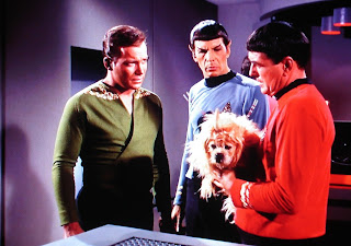 Meanwhile, in the transporter room, Scotty has a sweet dog in a fluffy costume in one arm and a similar dog in appearance that is more vicious and more aggressively "animal" in a cage. It really had me smiling to see those dogs in their little costumes again. Scotty indicates shortly after receiving the first dog through the transporter they received a duplicate, ferocious, "opposite" dog. All parties are on hold for further transportation including Sulu who must remain on the planet below. The pieces are coming together.