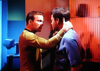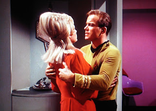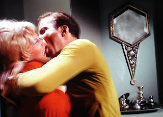 Upon arrival to her quarters, Rand finds "Jim" in her room and she's a might uncomfortable given Kirk's uncharacteristic behavior. While his advances toward her might normally be welcomed all is not right with her dear Captain and she knows it. He essentially mauls her in a near rape sequence. It's a fairly intense, disturbing event for 1960s television. I know I was uncomfortable watching it myself. She scratches his face to get away. The door opens and Rand pleads for Spock's help. A man runs for assistance, but is knocked out by this dark, unconscionable version of Kirk.