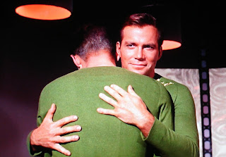 In sick bay, evil Kirk is dying. Gentle Kirk holds evil Kirk's hand and brings him back into focus for a time. This is kind of funny, but deliciously classic Kirk.