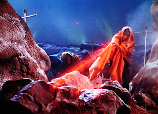 With the inability to take another transporter risk the four men on the planet below must remain there including Lt. Hikaru Sulu. Unfortunately, the planetary temps dip below 120 below zero at night [you'll recall The Sci-Fi Fanatic's own The Great Ice Planet Adventure, but honest I had no idea as Kirk & Bones were clearly the principals in harm's way]. Kirk and Spock know evil or "wild man" Kirk must be captured, not killed, so they can solve this transporter splicing issue.