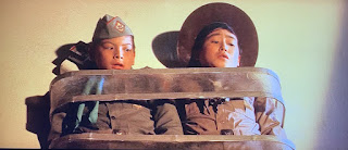 It's not a complete wreck of a short movie, but the Gamera outing is indeed hamstrung by budget restrictions. The film even defaults to a large segment of re-utilized footage from both Gamera Vs. Barugon (1966) and Gamera Vs. Gyaos (1967). Having seen both fairly recently combined with a busy schedule I was forced to simply fast forward through the re-used footage. All of this and the film was just 72 minutes to begin with.